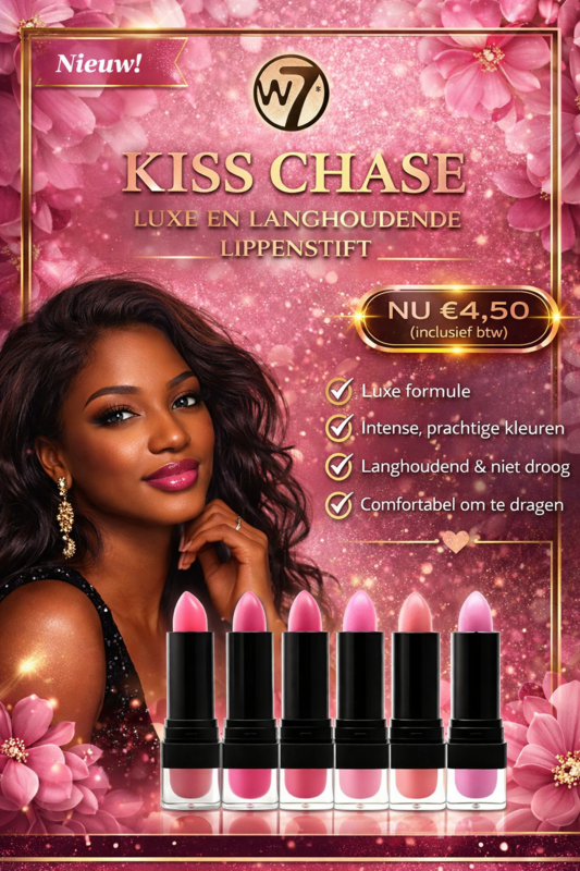 Gebruik voor het aanbrengen van de W7 Kiss Chase Lippenstift de W7 Lip Twister Lipliner. Deze lipliner helpt de draagduur van je lipstick te vergroten en voorkomt dat de lipstick uitloopt. Hierdoor blijven je lippen de hele dag door perfect.