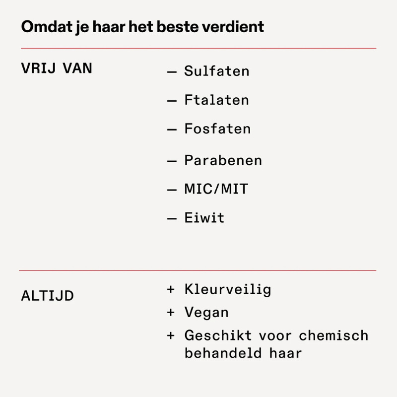 - Verbetert handelbaarheid en temt pluis Kleurveilig, vegan & vrij van sulfaten, parabenen en siliconen