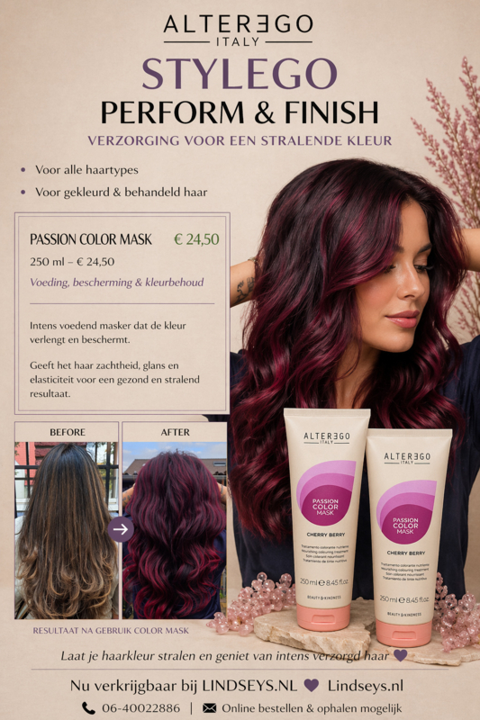 Geef je haar de ultieme combinatie van voeding, glans en kleur met de Alter Ego Passion Color Mask - Cherry Berry!